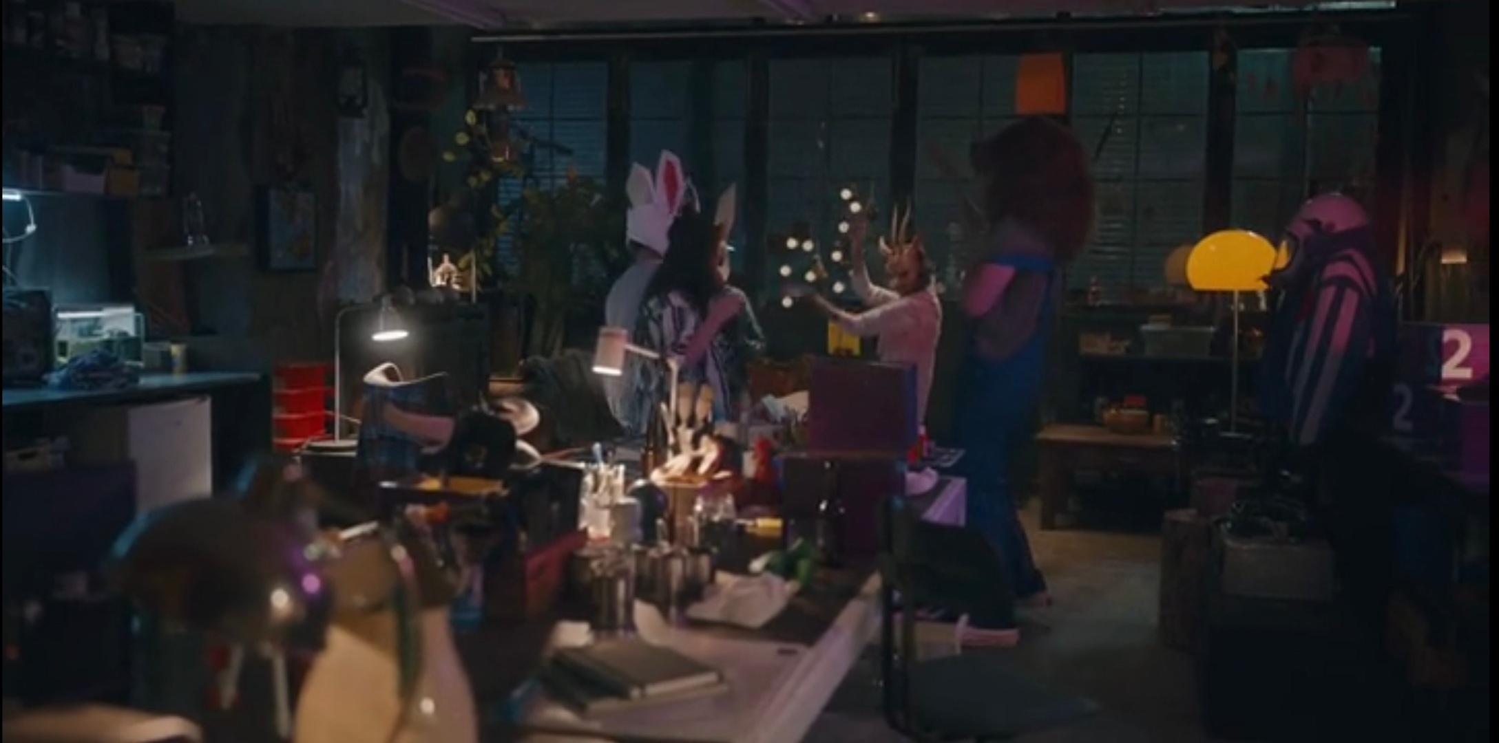 그들의 생각과 다양한 시도, 열정을 대변하는 듯 책상위에 올려진 복잡한 소품들과 조명이 어우러져 친구들의 아이디어와 이야기가 넘치는 작업실로 비춰지는 영화 속 장면입니다.
