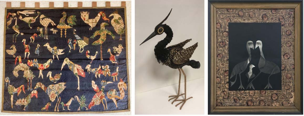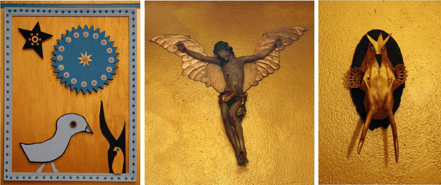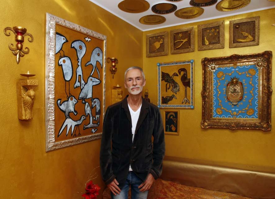 오늘은 모든 것이 금이다. "나는 황금기를 맞이하고 있습니다." 그는 현재의 자신에 대해 이렇게 표현합니다. 태양의 색이기도 한 금, 천장을 포함한 방 전체를 황금빛으로 칠했습니다. 새들은 추상화되거나 바로크 양식 등으로 표현됩니다. 어떤 것들은 태피스트리에 그려져 있고, 어떤 것들은 조각되어 있고, 펜치로 새를 만들기도 했습니다.