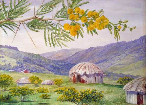 그녀가 남아프리카를 여행하면서 그린 이 그림에는 드넓은 평야에 지어진 움막 주변으로 관목형태의 호주 아카시아가 아름답게 자라고 있습니다.